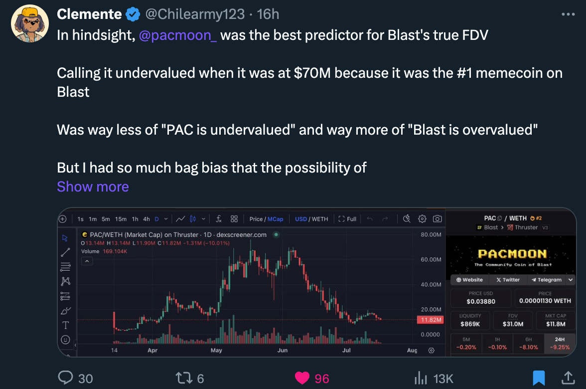 Blur's activity on Blast has tanked, crashing from over 10k ETH daily to under 2000 ETH.