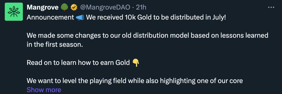 Mangrove is dishing out 10,000 Gold this July for users who fuel their strategies with liquidity.