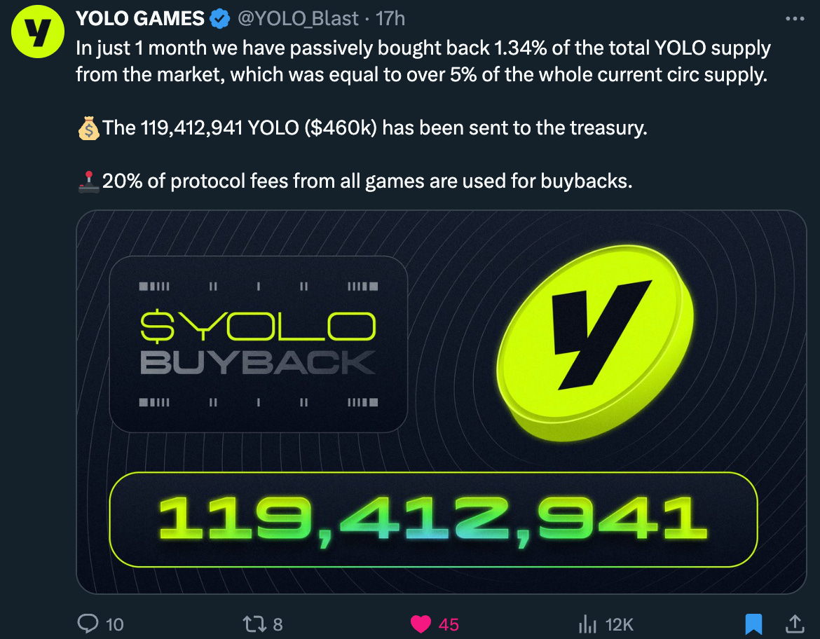 YOLO has repurchased around 120m $YOLO, worth $460k, using 20% of its protocol fees.