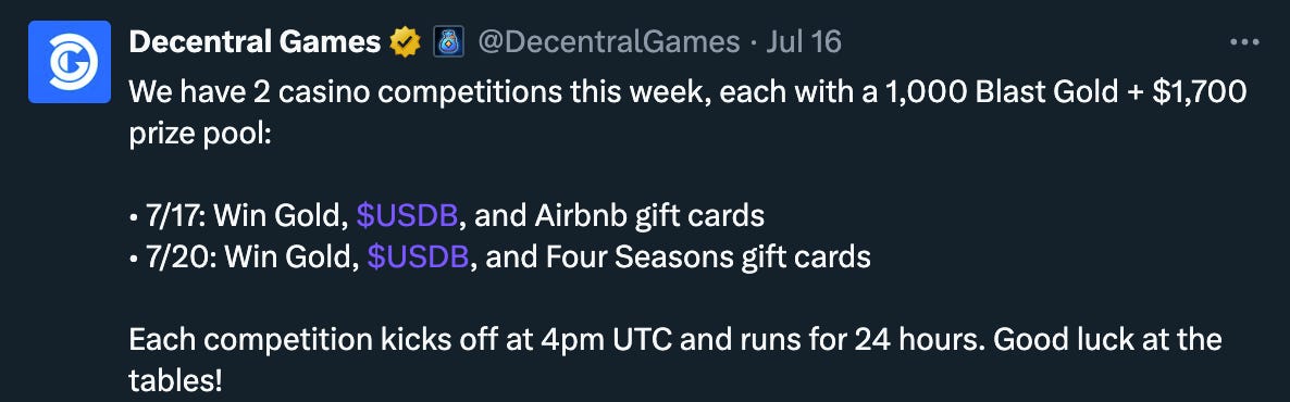 7/17: Score Gold, $USDB, and Airbnb gift cards