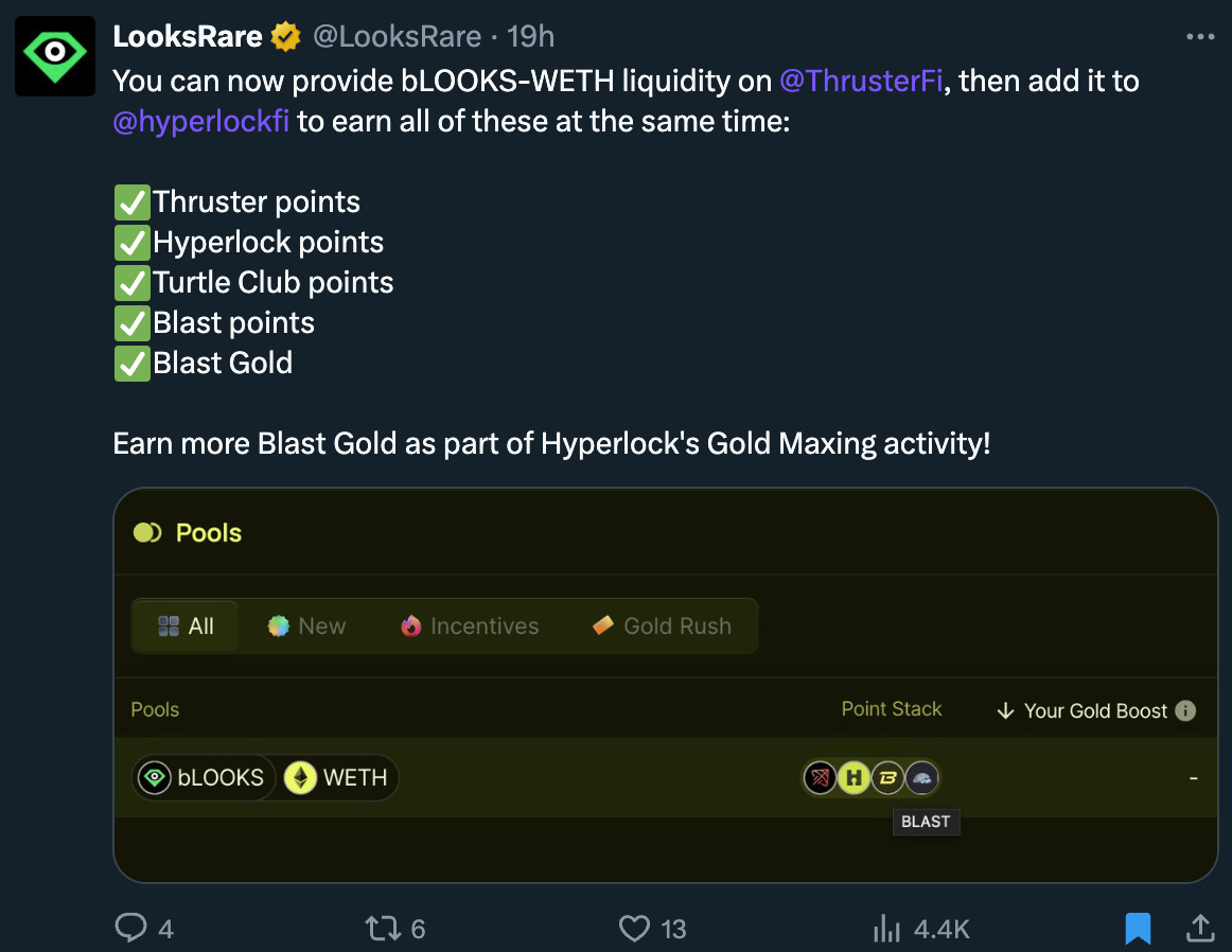 You can now provide bLOOKS-WETH liquidity on @ThrusterFi and then stake it on @hyperlockfi