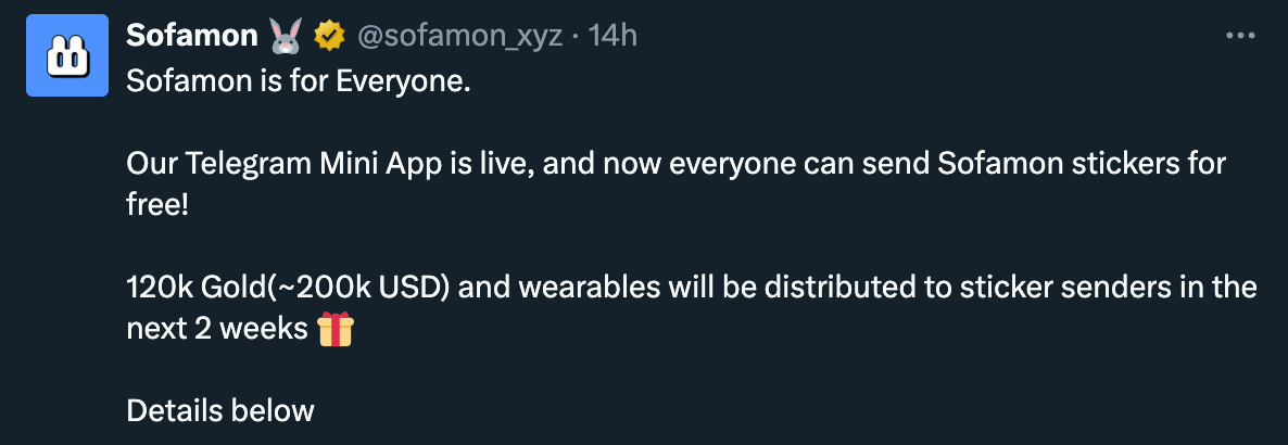 Gold airdrops to wearable holders who send stickers (current wearable price: 0.1E)