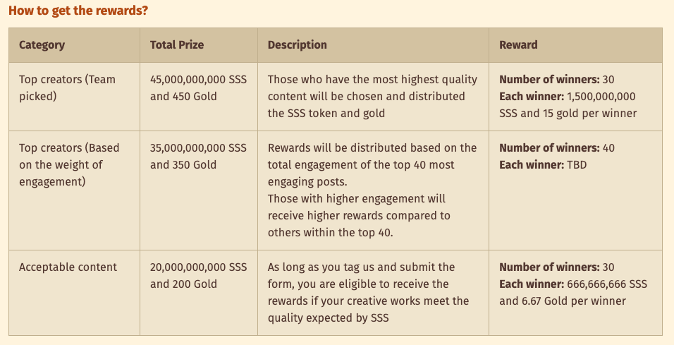 Acceptable Content: Craft top-notch content, tag it with SSS, and submit the form. 30 winners get 666 million SSS & 6.67 Gold.