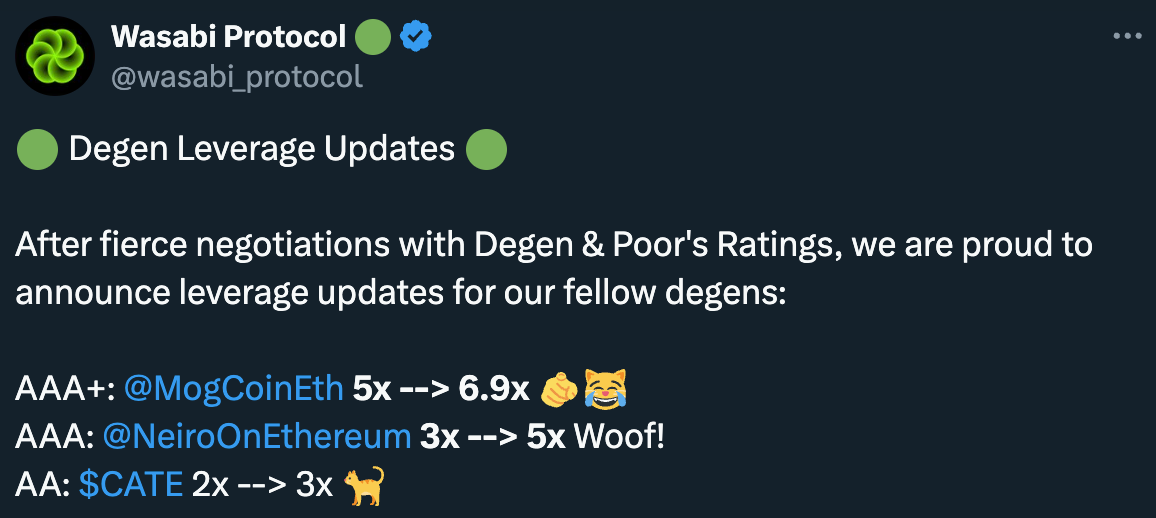Degens, this one’s for you! Wasabi Protocol just leveled up the leverage game after some fierce talks. MogCoinEth’s leverage has gone full meme from 5x to 6.9x—yup, nice. $Neiro pumped from 3x to 5x, and $CATE is now running 3x leverage (up from 2x). If you’re looking to play big, the time is now. Get those stacks!