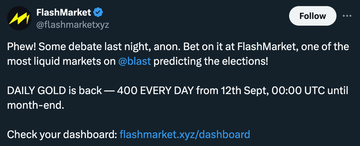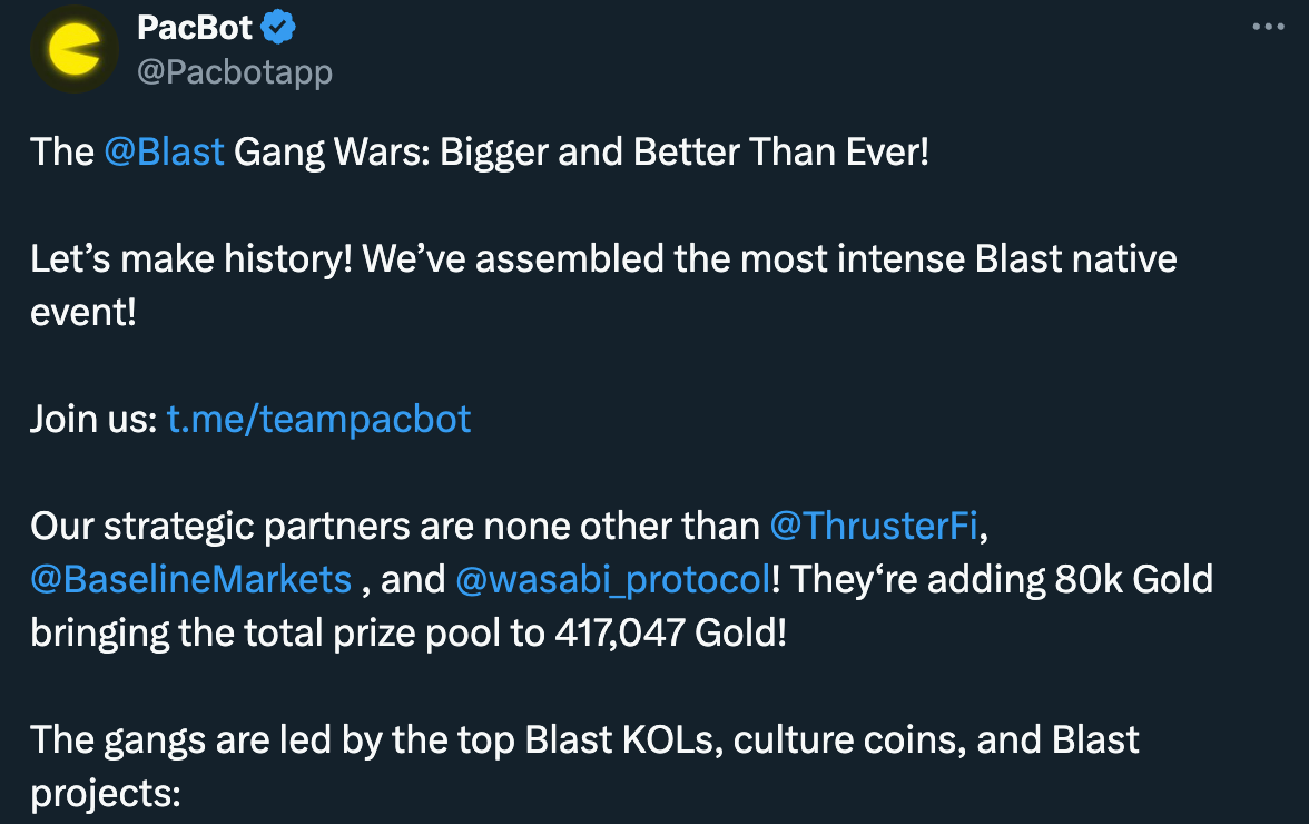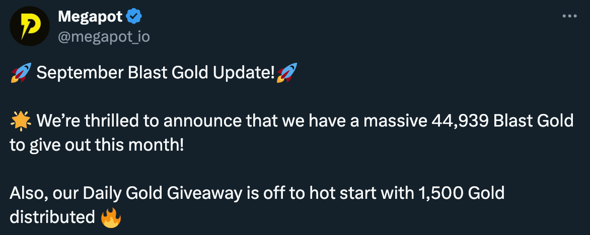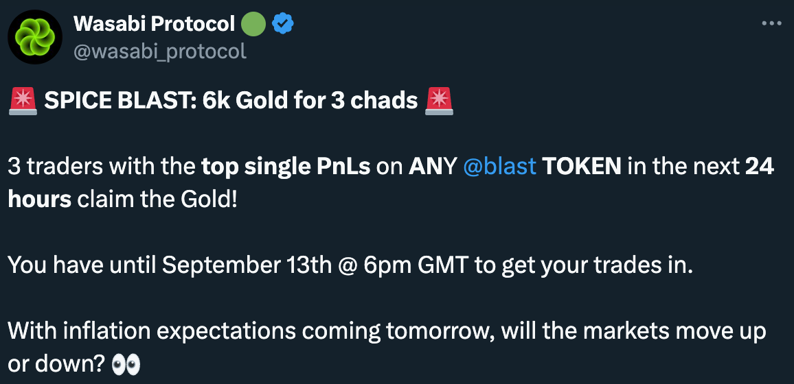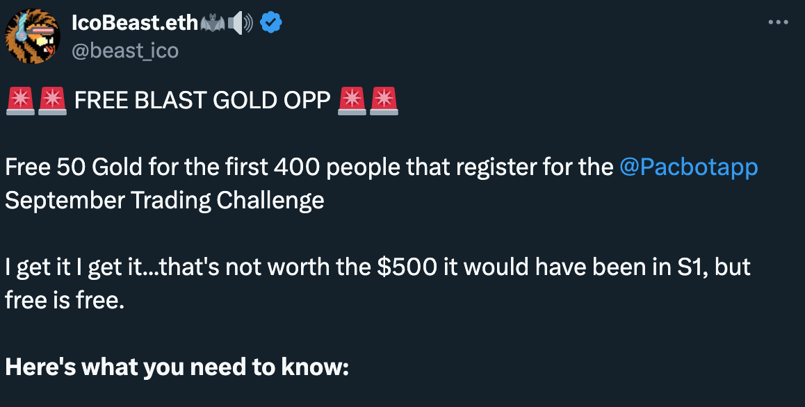The top 3 traders with the highest PnLs on any Blast token in the next 24 hours will get 6k Gold. That’s right, you’ve got until September 13, 6 PM GMT to get your trades in and potentially bag the gold.