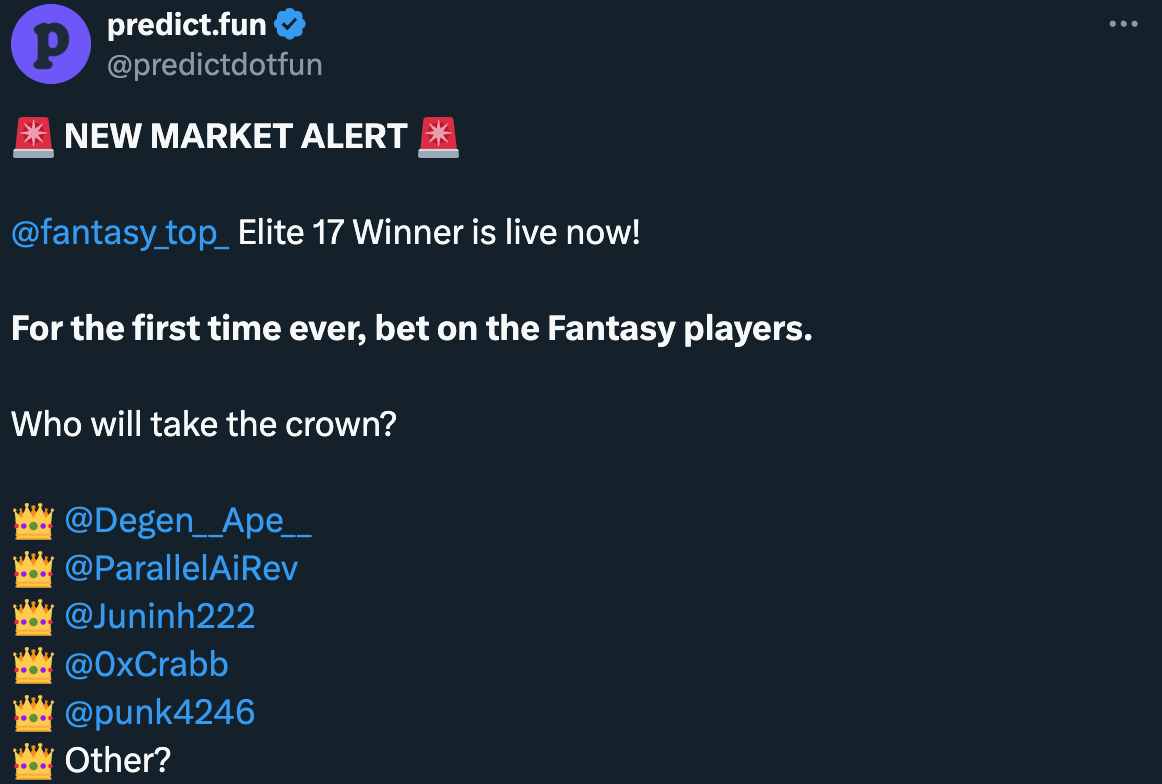 Predictdotfun just opened up a new market for Fantasy players to bet on who’s going to take the crown in the Elite 17 tournament.