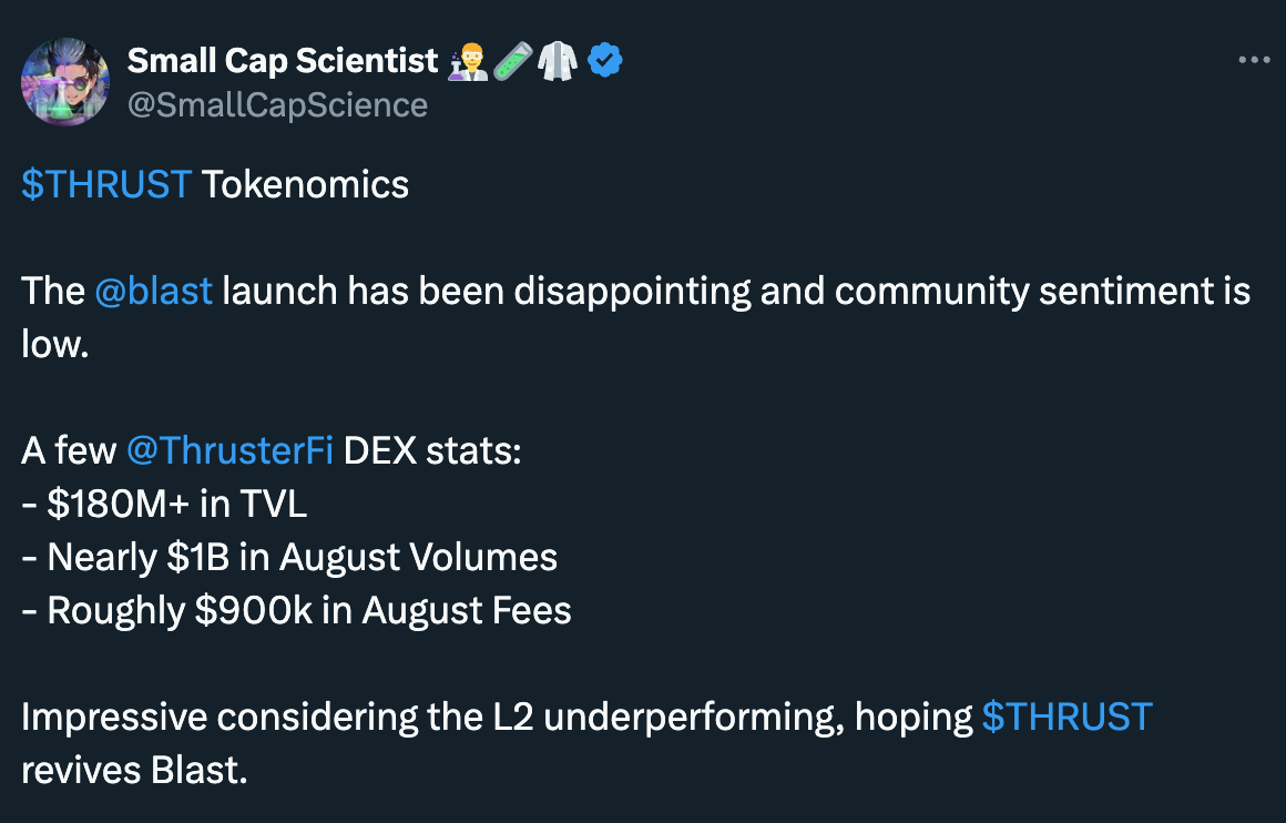 Community’s feeling meh, but the stats are fire: Even though the Blast launch didn’t hit as expected, Thruster’s stats are kinda insane: