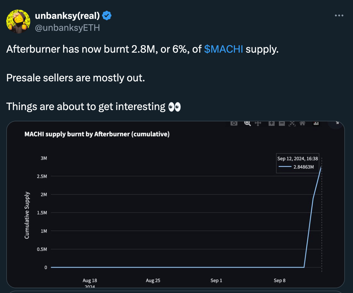 The Afterburner mechanism has been doing work, burning a whopping 2.8 million $MACHI tokens—that’s around 6% of the entire supply! Most of the presale sellers are now out of the picture, so we might be on the verge of something big here. Things are about to get spicy, so keep your eyes peeled for what’s next. 👀