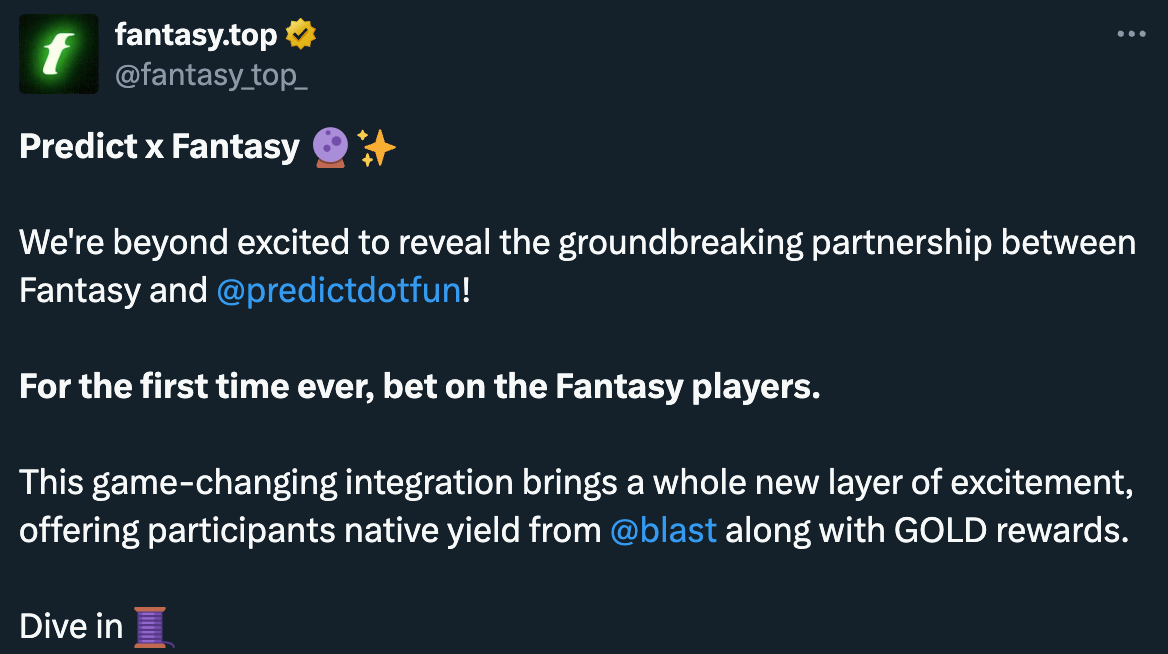 Fantasy just dropped a major partnership with Predict, and it’s a game-changer. Now you can bet on Fantasy players, earn yield from Blast, and stack those GOLD rewards all at the same time. Fantasy’s already a playground where builders and players can get creative with new social mechanisms, but adding Predict into the mix takes things to the moon. Predict's prediction market is straight-up fire, raking in $8.7 million in market swap volume within just a few days.