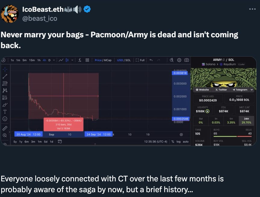 Pacmoon launched in Feb 2024, popping off with its socialfi features on Blast. But fast-forward to July, and things took a nosedive when Elon's privatization of "likes" threw their system out the window. By August, Pacmoon rebranded as ARMY and yeeted over to Solana, but things went from bad to worse.