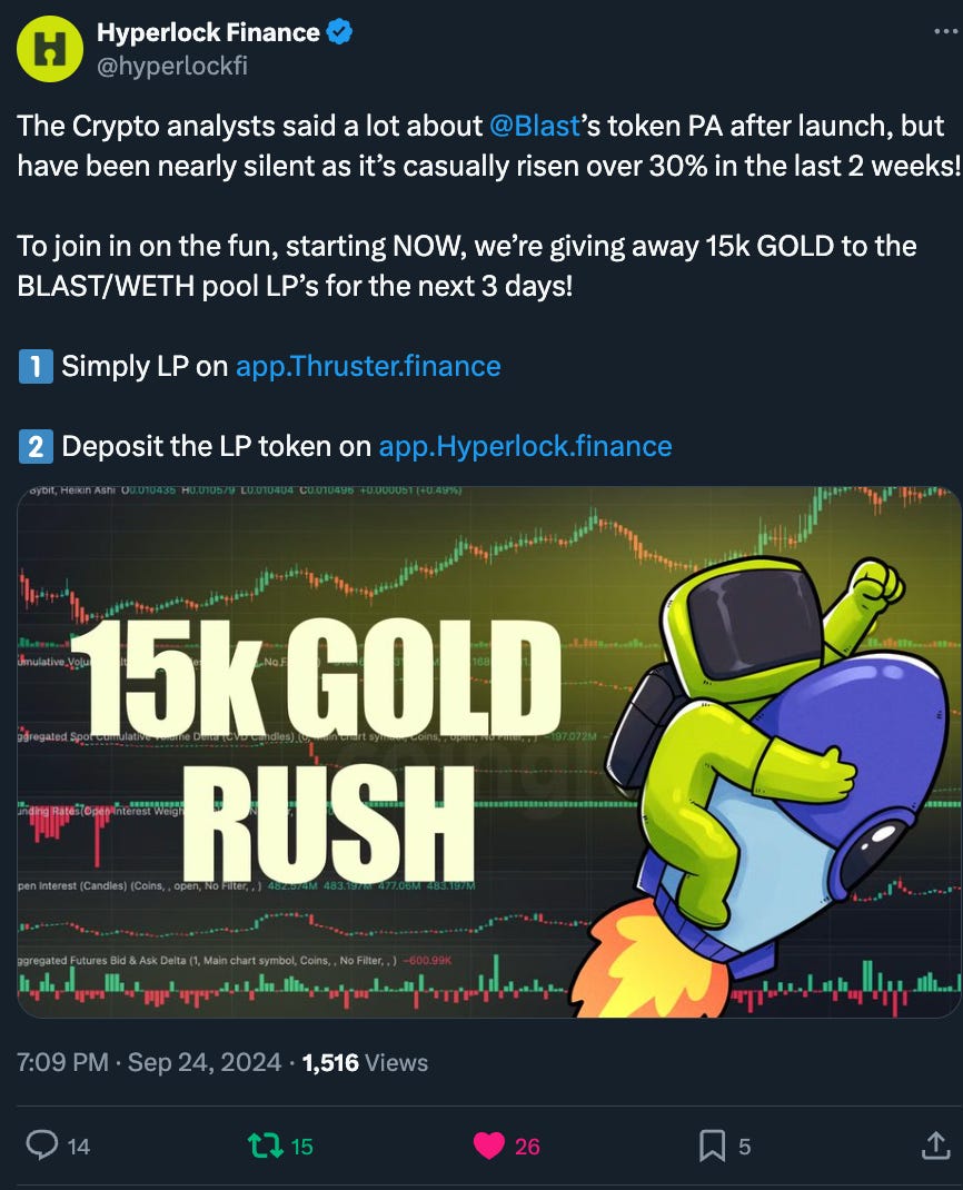 ICYMI, Thruster and Hyperlock are throwing down 15k Gold for $BLAST/WETH liquidity providers. There’s just one day left to grind and rack up those rewards.