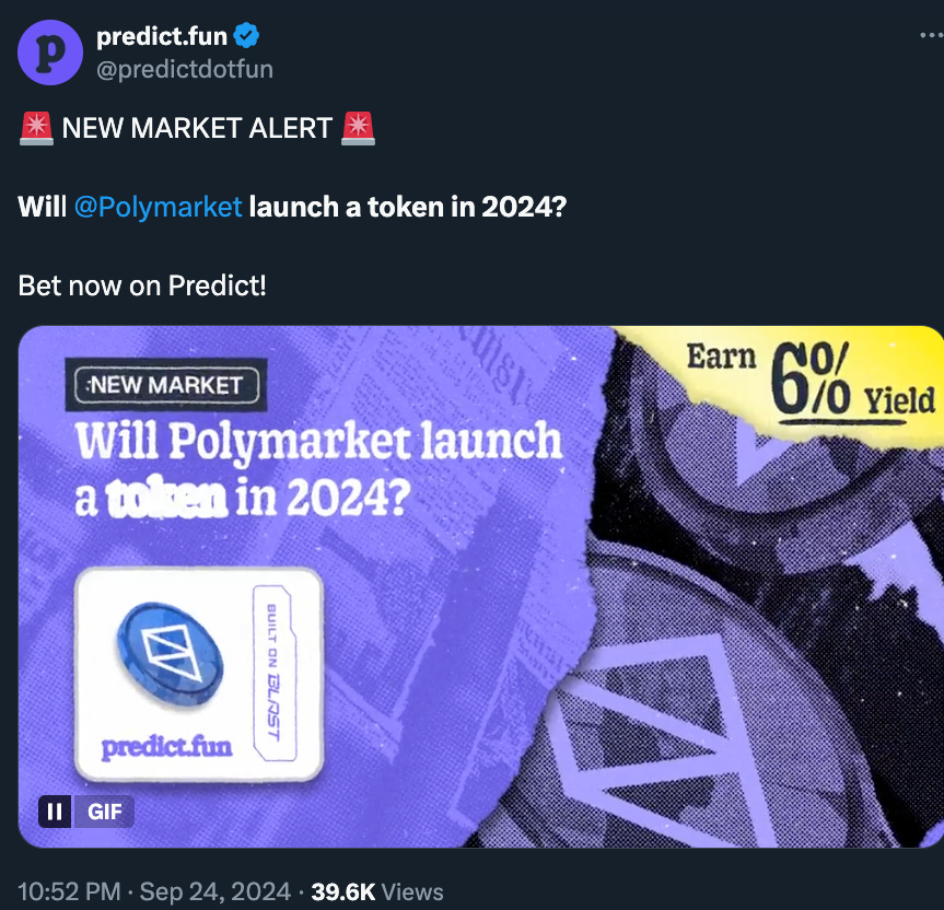 Predict.fun has a new market up: "Will Polymarket launch a token in 2024?"