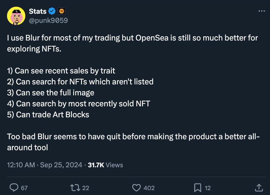 Even though Blur is the go-to for most traders, OpenSea is still MVP for exploring NFTs. Blur needs some buffs. Here’s what it’s missing: