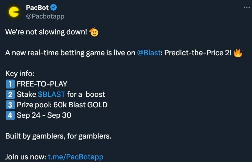 Pacbot just dropped a new real-time betting game on Blast: Predict-the-Price 2. It’s free-to-play, and you can stake $BLAST to boost your chances of taking home a chunk of the 60k Blast GOLD prize pool.