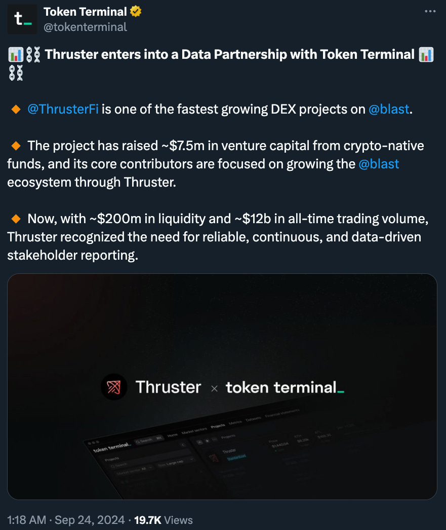 Big plays ahead! Thruster, the fast-growing DEX on Blast, is teaming up with Token Terminal for a data partnership that’ll level up its onchain analytics and keep stakeholders in the loop.